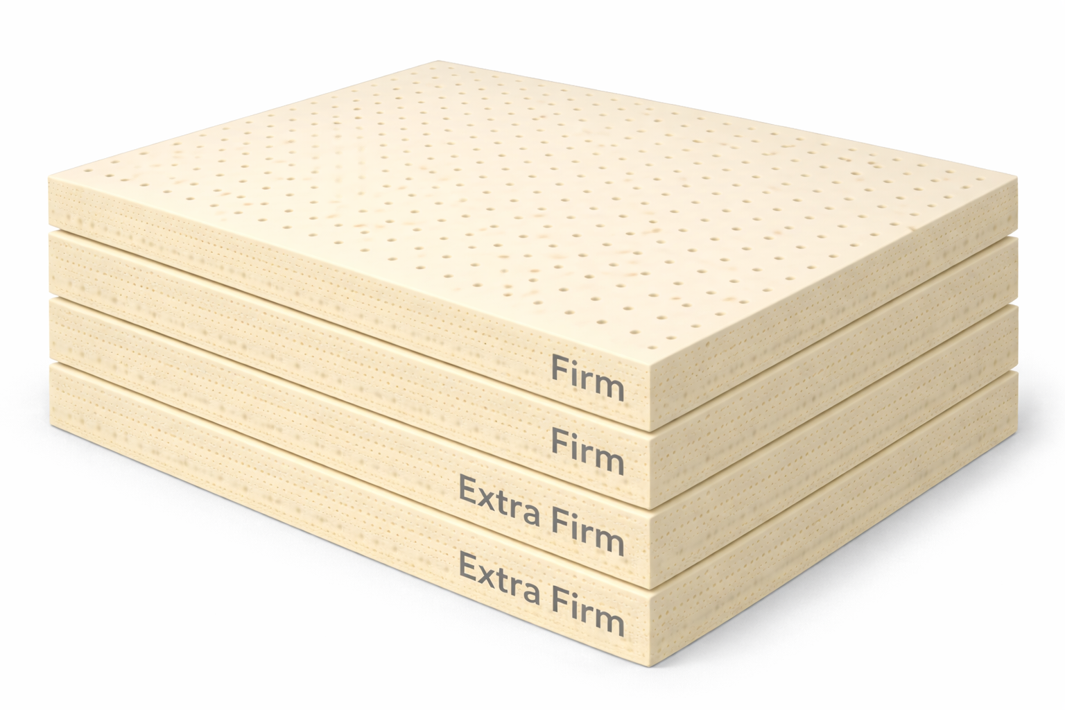 Bên trong lõi nệm là cấu trúc bốn lớp cao su thiên nhiên, được thiết kế để mang lại độ ổn định cấu trúc vượt trội và khả năng đàn hồi bền bỉ theo thời gian. Cấu hình Firm – Firm – Extra Firm – Extra Firm tạo nên hệ thống nâng đỡ mạnh mẽ, giúp duy trì tư thế cột sống tự nhiên và phân bổ trọng lượng cơ thể đồng đều trên toàn bộ bề mặt nệm.